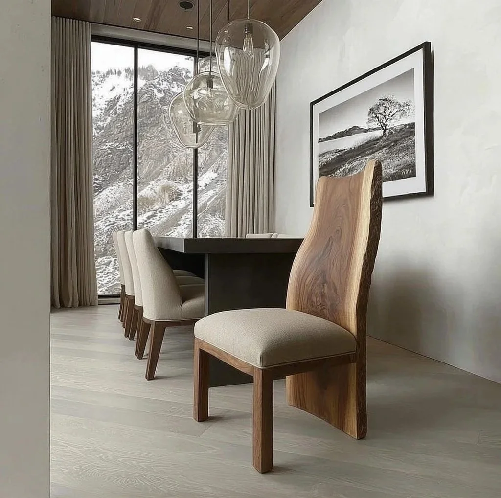 Live edge wood retains the natural contour of the tree, meaning no two chairs are identical. That subtle irregularity is what gives them presence in a dining space. Rather than trying to perfect nature, the design celebrates it.
